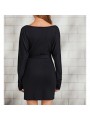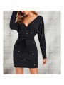 Vestido negro con cuello cruzado y perlas